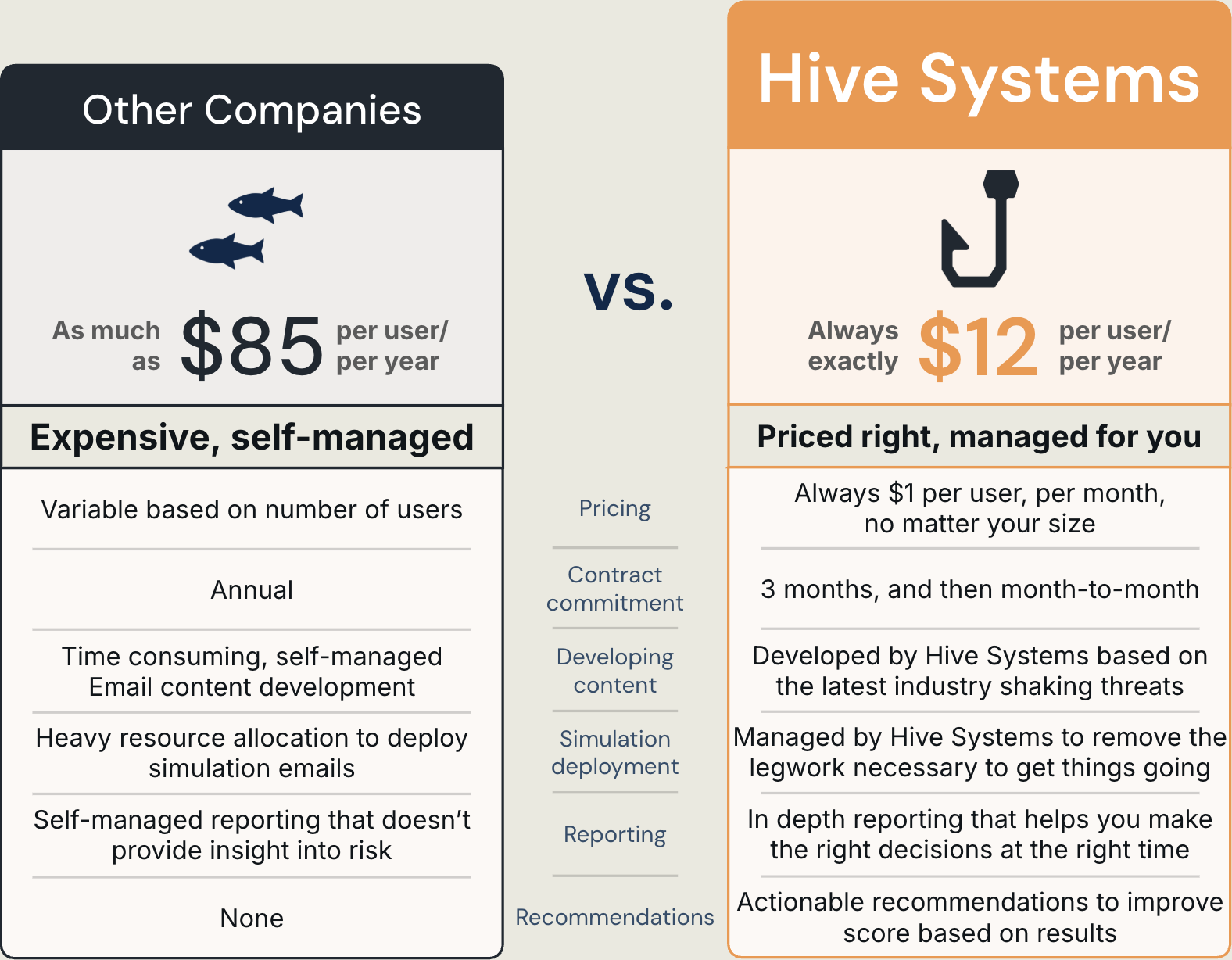Hive Systems charges less than other companies. In fact, we only charge $1 per user, per month and manage the process for you.